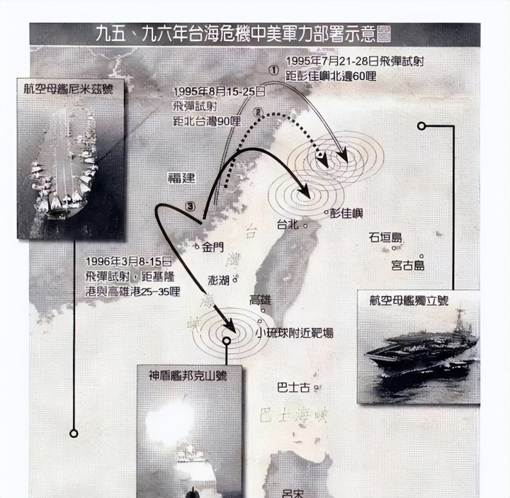 想想三十年前的事,那时候中国海军在台海面对美国航母群,确实挺憋屈的。1995年李登辉去美国演讲,讲了些挑战一中原则的话,大陆这边就启动导弹试射,从七月到次年三月,好几枚东风-15落进台湾附近海域。