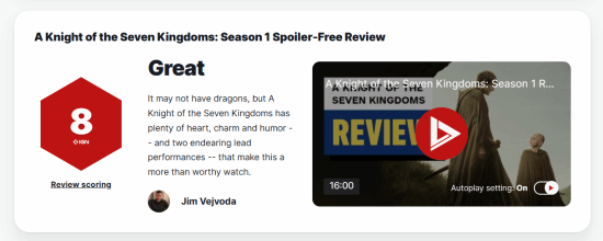 IGN官方发布了《七王国的骑士》第一季的无剧透评测文章乾盘配资,给出8分的好评。